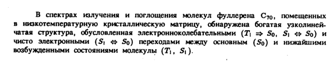 В спектрах излучения и поглощения молекул фуллерена С70, помещенных в низкотемпературную кристаллическую матрицу, обнаружена богатая узколинейчатая структура, обусловленная электронноколебательными (Γι So, Si о So) и чисто электронными (5| о So) переходами между основным (So) и нижайшими возбужденными состояниями молекулы (Ti, Si).
