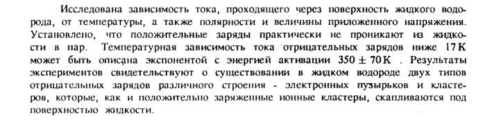 Исследована зависимость тока, проходящего через поверхность жидкого водорода, от температуры, а также полярности и величины приложенного напряжения. Установлено, что положительные заряды практически не проникают из жидкости в пар. Температурная зависимость тока отрицательных зарядов ниже 17 К может быть описана экспонентом с энергией активации 350 ± 70 К . Результаты экспериментов свидетельствуют о существовании в жидком водороде двух типов отрицательных зарядов различного строения электронных пузырьков и кластеров, которые, как и положительно заряженные ионные кластеры, скапливаются под поверхностью жидкости.