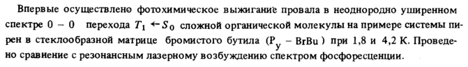 Впервые осуществлено фотохимическое выжигание провала в неоднородно уширенном спектре 0-0 перехода Тх *~Sq сложной органической молекулы на примере системы пи-рен в стеклообразной матрице бромистого бутила (Ру ВгВи) при 1,8 и 4,2 К. Проведено сравнение с резонансным лазерному возбуждению спектром фосфоресценции.