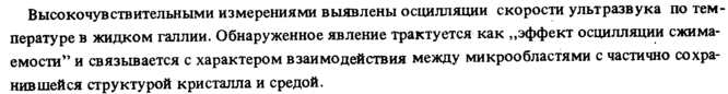 Высокочувствительными измерениями выявлены осцилляции скорости ультразвука по температуре в жидком галлии. Обнаруженное явление трактуется как „эффект осцилляции сжимаемости" и связывается с характером взаимодействия между микрообластями с частично сохранившейся структурой кристалла и средой.