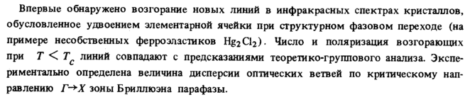 Впервые обнаружено возгорание новых линий в инфракрасных спектрах кристаллов, обусловленное удвоением элементарной ячейки при структурном фазовом переходе (на примере несобственных ферроэластиков Hg2Cl2). Число и поляризация возгорающих при Τ < Тс линий совпадают с предсказаниями теоретико-группового анализа. Экспериментально определена величина дисперсии оптических ветвей по критическому направлению Г-+Х зоны Бриллюэна парафазы.