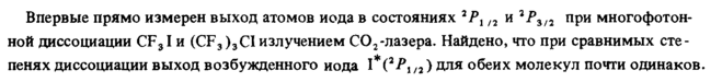 Впервые прямо измерен выход атомов иода в состояниях 2Р1 п и 2Psn при многофотонной диссоциации CF3I и (CF3)3CI излучением С02-лазера. Найдено, что при сравнимых степенях диссоциации выход возбужденного иода 1*(2Р1/2) для обеих молекул почти одинаков.