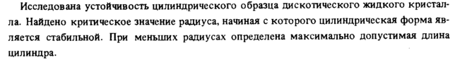 Исследована устойчивость цилиндрического образца дискотического жидкого кристалла. Найдено критическое значение радиуса, начиная с которого цилиндрическая форма является стабильной. При меньших радиусах определена максимально допустимая длина цилиндра.