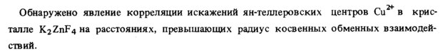 Обнаружено явление корреляции искажений ян-теллеровских центров Си в кристалле K2ZnF4 на расстояниях, превышающих радиус косвенных обменных взаимодействий.