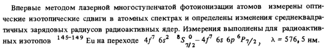 Впервые методом лазерной многоступенчатой фотоионизации атомов измерены оптические изотопические сдвиги в атомных спектрах и определены изменения среднеквадратичных зарядовых радиусов радиоактивных ядер. Измерения выполнены для радиоактивных изотопов 145-149 Ей на переходе 4/7 6s2 *$°2~ 4/? 6s 6р 6ΡΊ/2 ; λ = 576, 5 нм.