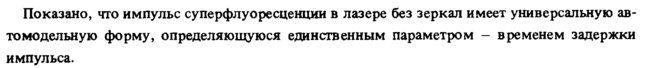 Показано, что импульс суперфлуоресценции в лазере без зеркал имеет универсальную автомодельную форму, определяющуюся единственным параметром временем задержки импульса.