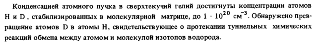 Конденсацией атомного пучка в сверхтекучий гелий достигнуты концентрации атомов 2 0 —3 Η и D , стабилизированных в молекулярной матрице, до 1 · 10 см . Обнаружено превращение атомов D в атомы Н, свидетельствующее о протекании туннельных химических реакций обмена между атомом и молекулой изотопов водорода.