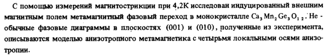 С помощью измерений магнитострикции при 4,2К исследован индуцированный внешним магнитным полем метамагнитный фазовый переход в монокристалле Са3Mn2Ge30,2. Не -обычные фазовые диаграммы в плоскостях (001) и (010), полученные из эксперимента, описываются моделью анизотропного метамагнетика с четырьмя локальными осями анизотропии.