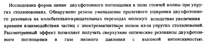 Исследована форма линии двухфотонного поглощения в поле стоячей волны при упругих столкновениях. Обнаружено резкое уменьшение пролетного уши рения двухфотонного резонанса на колебательно-вращательных переходах молекул вследствие увеличения времени взаимодействия частиц с электромагнитным полем из-за упругих столкновений. Рассмотренный эффект позволяет получать сверхузкие оптические резонансы двухфотонного поглощения в газе низкого давления с высокой интенсивностью.