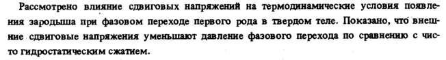 Рассмотрено влияние сдвиговых напряжений на термодинамические условия появления зародыша при фазовом переходе первого рода в твердом теле. Показано, что внешние сдвиговые напряжения уменьшают давление фазового перехода по сравнению с чисто гидростатическим сжатием.