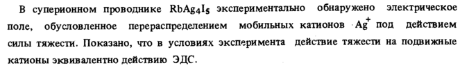 В суперионном проводнике RbAg^s экспериментально обнаружено электрическое поле, обусловленное перераспределением мобильных катионов Ag+ под действием силы тяжести. Показано, что в условиях эксперимента действие тяжести на подвижные катионы эквивалентно действию ЭДС.