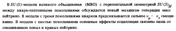 В SU(5)-модели великого объединения (МВО) с горизонтальной симметрией SU(3)^ между кварк-лептонными поколениями обсуждается новый механизм генерации масс нейтрино. В модели с тремя поколениями кварков предсказывается сильное смешивание. В модели с шестью поколениями основные эффекты осцилляции связаны лишь со смешиванием левых и правых нейтрино.