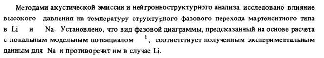 Методами акустической эмиссии и нейтронноструктурного анализа, исследовано влияние высокого давления на температуру структурного фазового перехода мартенситного типа в Li и Na, Установлено, что вид фазовой диаграммы, предсказанный на основе расчета с локальным модельным потенциалом 1 > соответствует полученным экспериментальным данным для Na и противоречит им в случае Li.