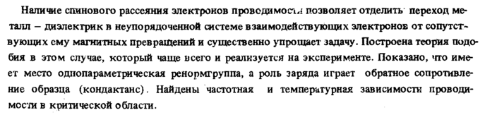 Наличие спинового рассеяния электронов проводимосы позволяет отделить переход металл диэлектрик в неупорядоченной системе взаимодействующих электронов от сопутствующих ему магнитных превращений и существенно упрощает задачу. Построена теория подобия в этом случае, который чаще всего и реализуется на эксперт менте. Показано, что имеет место однопараметрическая ренормгруппа, а роль заряда играет обратное сопротивление образца (кондактанс). Найдены частотная и температурная зависимости проводимости в критической области.