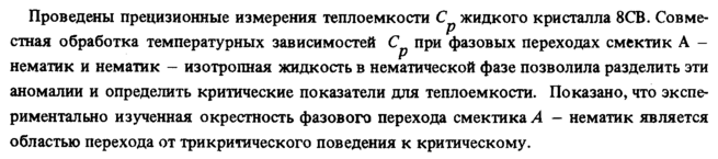 Проведены прецизионные измерения теплоемкости жидкого кристалла 8СВ. Совместная обработка температурных зависимостей при фазовых переходах смектик А -нематик и нематик изотропная жидкость в нематической фазе позволила разделить эти аномалии и определить критические показатели для теплоемкости. Показано, что экспериментально изученная окрестность фазового перехода смектикаЛ нематик является областью перехода от три критического поведения к критическому.