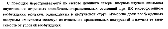 С помощью перестраиваемого по частоте диодного лазера впервые изучена динамика опустошения отдельных колебательно-вращательных состояний при ИК многофотонном возбуждении молекул, охлажденных в импульсной струе. Измерена доля возбужденных лазерным импульсом молекул из отдельных вращательных подуровней и изучена ее зависимость от условий возбуждения.
