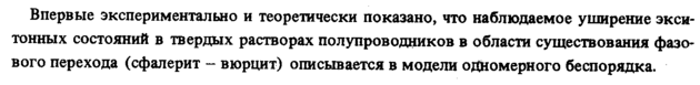Впервые экспериментально и теоретически показано, что наблюдаемое уширение экси-тонных состояний в твердых растворах полупроводников в области существования фазового перехода (сфалерит вюрцит) описывается в модели одномерного беспорядка.