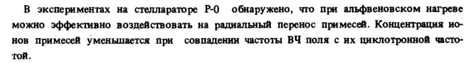 В экспериментах на стеллараторе Р-0 обнаружено, что при альфвеновском нагреве можно эффективно воздействовать на радиальный перенос примесей. Концентрация ионов примесей уменьшается при совпадении частоты ВЧ поля с их циклотронной частотой.