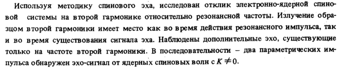 Используя методику спинового эха, исследован отклик электронно-ядерной спиновой системы на второй гармонике относительно резонансной частоты. Излучение образцом второй гармоники имеет место как во время действия резонансного импульса, так и во время существования сигнала эха. Наблюдены дополнительные эхо, существующие только на частоте второй гармоники. В последовательности два параметрических импульса обнаружен эхо-сигнал от ядерных спиновых волн с К Ф$.