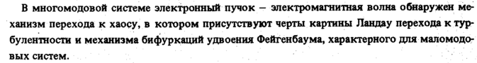 В многомодовой системе электронный пучок электромагнитная волна обнаружен механизм перехода к хаосу, в котором присутствуют черты картины Ландау перехода к турбулентности и механизма бифуркаций удвоения Фейгенбаума, характерного для маломодо-вых систем.