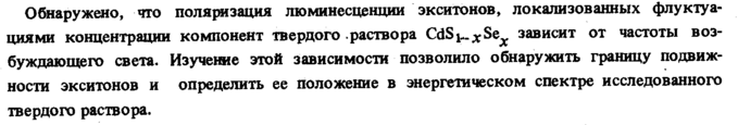 Обнаружено, что поляризация люминесценции экситонов, локализованных флуктуация ми концентрации компонент твердого раствора CdS^^Se зависит от частоты воз-буждающего света. Изучение этой зависимости позволило обнаружить границу подвижности экситонов и определить ее положение в энергетическом спектре исследованного твердого раствора.