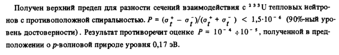 Получен верхний предел для разности сечений взаимодействия с 2 3 3 U тепловых Нейтронов с противоположной спиральностью. Ρ = (σ * ор/(о + + σ~ ) < 1,5-10" 6 (90%-ный уровень достоверности). Результат противоречит оценке Ρ = 10" 4 4-10"5, полученной в предположении о р-волновой природе уровня 0,17 эВ.
