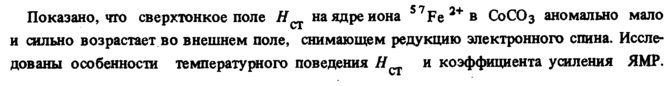 Показано, что сверхтонкое поле Я„ на ядре иона 57Fe2+B С0СО3 аномально мало и сильно возрастает во внешнем поле, снимающем редукцию электронного спина. Исследованы особенности температурного поведения Η и коэффициента усиления Я MP.