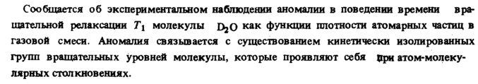 Сообщается об экспериментальном наблюдении аномалии в поведении времени вращательной релаксации Т\ молекулы DjO как функции плотности атомарных частиц в газовой смеси. Аномалия связывается с существованием кинетически изолированных групп вращательных уровней молекулы, которые проявляют себя При атом-молекулярных столкновениях.
