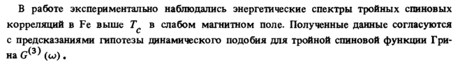 В работе экспериментально наблюдались энергетические спектры тройных спиновых корреляций в Fe выше Τ в слабом магнитном поле. Полученные данные согласуются с предсказаниями гипотезы динамического подобия для тройной спиновой функции Грина G(3)(u>).