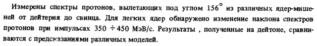 Измерены спектры протонов, вылетающих под углом 156 из различных ядер-ми теней от дейтерия до свинца. Для легких ядер обнаружено изменение наклона спектров протонов при импульсах 350 ^450 МэВ/с. Результаты , полученные на дейтоне, сравниваются с предсказаниями различных моделей.