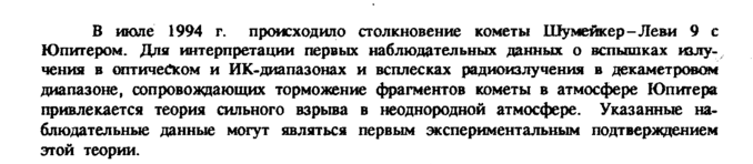 В июле 1994 г. происходило столкновение кометы Шумейкер Леви 9 с Юпитером. Для интерпретации первых наблюдательных данных о вспышках излучения в оптическом и ИК-диапазонах и всплесках радиоизлучения в декаметровом диапазоне, сопровождающих торможение фрагментов кометы в атмосфере Юпитера привлекается теория сильного взрыва в неоднородной атмосфере. Указанные наблюдательные данные могут являться первым экспериментальным подтверждением этой теории.