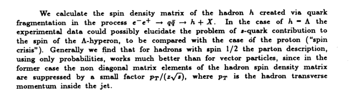 We calculate the spin density matrix of the hadron h created via quark fragmentation in the process e~e* —♦ qq —* h -{X. In the case of h — A the experimental data could possibly elucidate the problem of j-quark contribution to the spin of the Λ-hyperon, to be compared with the case of the proton ("spin crisis"). Generally we find that for hadrons with spin 1/2 the parton description, using only probabilities, works much better than for vector particles, since in the former case the non diagonal matrix elements of the hadron spin density matrix are suppressed by a small factor Рт/(*л/*)» where ρχ is the hadron transverse momentum inside the jet.