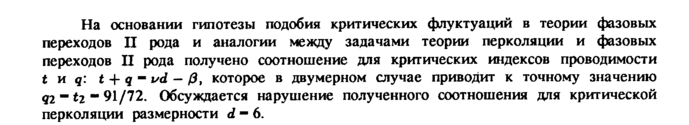 На основании гипотезы подобия критических флуктуаций в теории фазовых переходов И рода и аналогии между задачами теории перколяции и фазовых переходов II рода получено соотношение для критических индексов проводимости t и q: t + g ud /3, которое в двумерном случае приводит к точному значению " tz 91 /72. Обсуждается нарушение полученного соотношения для критической перколяции размерности d 6.