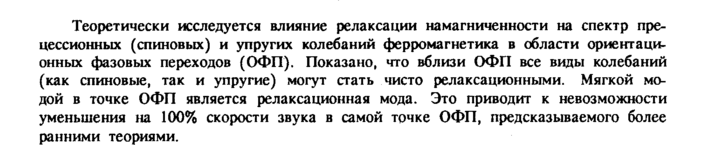 Теоретически исследуется влияние релаксации намагниченности на спектр прецессионных (спиновых) и упругих колебаний ферромагнетика в области ориентаци-онных фазовых переходов (ОФП). Показано, что вблизи ОФП все виды колебаний (как спиновые, так и упругие) могут стать чисто релаксационными. Мягкой модой в точке ОФП является релаксационная мода. Это приводит к невозможности уменьшения на 100% скорости звука в самой точке ОФП, предсказываемого более ранними теориями.