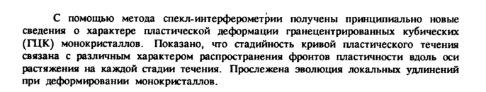 С помощью метода спекл-интерферометрии получены принципиально новые сведения о характере пластической деформации гранецентрированных кубических (ГЦК) монокристаллов. Показано, что стадийность кривой пластического течения связана с различным характером распространения фронтов пластичности вдоль оси растяжения на каждой стадии течения. Прослежена эволюция локальных удлинений при деформировании монокристаллов.