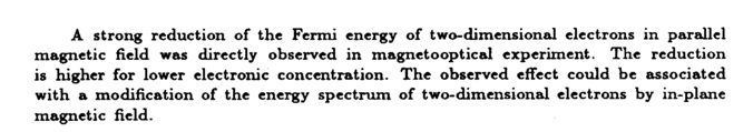 A strong reduction of the Fermi energy of two-dimensional electrons in parallel magnetic field was directly observed in magnetooptical experiment. The reduction is higher for lower electronic concentration. The observed effect could be associated with a modification of the energy spectrum of two-dimensional electrons by in-plane magnetic field.