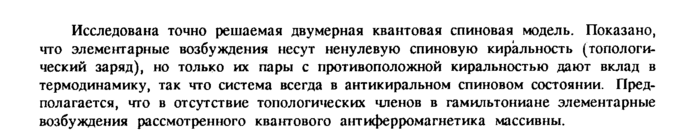 Исследована точно решаемая двумерная квантовая спиновая модель. Показано, что элементарные возбуждения несут ненулевую спиновую киральность (топологический заряд), но только их пары с противоположной киральностью дают вклад в термодинамику, так что система всегда в антикиральном спиновом состоянии. Предполагается, что в отсутствие топологических членов в гамильтониане элементарные возбуждения рассмотренного квантового антиферромагнетика массивны.