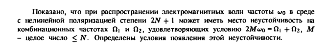 Показано, что при распространении электромагнитных волн частоты шо в среде с нелинейной поляризацией степени 2N + 1 может иметь место неустойчивость на комбинационных частотах Ω| и Ω2, удовлетворяющих условию 2Μωο П| 4-Ω2, Μ целое число < N. Определены условия появления этой неустойчивости.