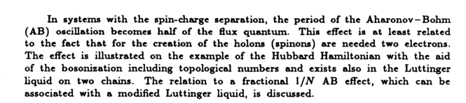 In systems with the spin-charge separation, the period of the Aharonov-Bohm (AB) oscillation becomes half of the flux quantum. This effect is at least related to the fact that for the creation of the holons (spinons) are needed two electrons. The effect is illustrated on the example of the Hubbard Hamiltonian with the aid of the bosonization including topological numbers and exists also in the Luttinger liquid on two chains. The relation to a fractional 1/iV AB effect, which can be associated with a modified Luttinger liquid, is discussed.