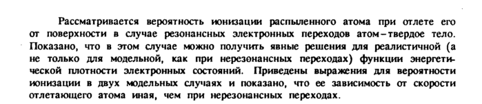 Рассматривается вероятность ионизации распыленного атома при отлете его от поверхности в случае резонансных электронных переходов атом-твердое тело. Показано, что в этом случае можно получить явные решения для реалистичной (а не только для модельной, как при нерезонансных переходах) функции энергетической плотности электронных состояний. Приведены выражения для вероятности ионизации в двух модельных случаях и показано, что ее зависимость от скорости отлетающего атома иная, чем при нерезонансных переходах.