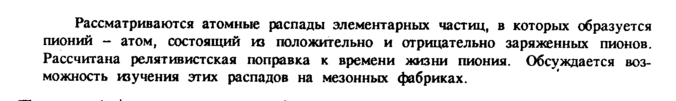 Рассматриваются атомные распады элементарных частиц, в которых образуется пионий атом, состоящий из положительно и отрицательно заряженных пионов. Рассчитана релятивистская поправка к времени жизни пиония. Обсуждается возможность изучения этих распадов на мезонных фабриках.