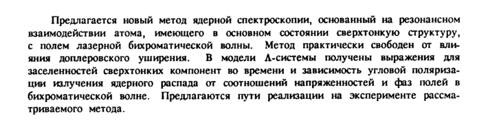 Предлагается новый метод ядерной спектроскопии, основанный на резонансном взаимодействии атома, имеющего в основном состоянии сверхтонкую структуру, с полем лазерной бихроматической волны. Метод практически свободен от влияния доплеровского уширения. В модели Α-системы получены выражения для заселенностей сверхтонких компонент во времени и зависимость угловой поляризации излучения ядерного распада от соотношений напряженностей и фаз полей в бихроматической волне. Предлагаются пути реализации на эксперименте рассматриваемого метода.