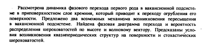 Рассмотрена динамика фазового перехода первого рода в вакансионной подсистеме в приповерхностном слое кремния, который приводит к переходу огрубления его поверхности. Предложено два возможных механизма возникновения пересыщения в вакансионной подсистеме. Найдена фазовая диаграмма перехода и вероятность распределения шероховатостей по высоте и волновому вектору. Предсказаны условия возникновения квазипериодических структур на поверхности и стохастических шероховатостей.