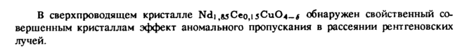 В сверхпроводящем кристалле Nd),&5Ceo,i5Cu04_f обнаружен свойственный совершенным кристаллам эффект аномального пропускания в рассеянии рентгеновских лучей.
