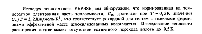 Исследуя теплоемкость YbPdSb, мы обнаружили, что нормированная на температуру электронная часть теплоемкости, Сс, достигает при Г-0,5К значений Се/Т 3, 2Дж/моль-К2, что соответствует рекордной для систем с тяжелыми ферми-онами эффективной массе дел окал изованных квазичастиц. Исследование теплового расширения подтверждает отсутствие магнитного перехода вплоть до 0,5 К.