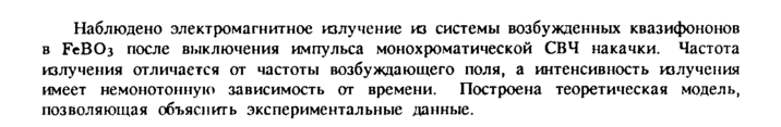 Наблюдено электромагнитное излучение из системы возбужденных квазифононов в FeBCb после выключения импульса монохроматической СВЧ накачки. Частота излучения отличается от частоты возбуждающего поля, а интенсивность излучения имеет немонотонную зависимость от времени. Построена теоретическая модель, позволяющая объяснить экспериментальные данные.