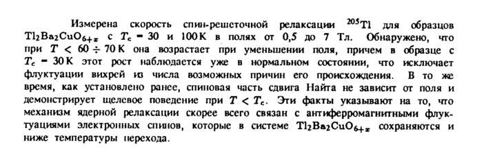 Измерена скорость спин-решеточной релаксации М5Т1 для образцов Tl2Ba2Cu06+x с Тс 30 и 100К в полях от 0,5 до 7 Тл. Обнаружено, что при Τ < 60 -J70 К она возрастает при уменьшении поля, причем в образце с Те 30 К этот рост наблюдается уже в нормальном состоянии, что исключает флуктуации вихрей из числа возможных причин его происхождения. В то же время, как установлено ранее, спиновая часть сдвига Найта не зависит от поля и демонстрирует щелевое поведение при Τ < Тс. Эти факты указывают на то, что механизм ядерной релаксации скорее всего связан с антиферромагнитными флук-туациями электронных спинов, которые в системе Т1гВа2Си06+х сохраняются и ниже температуры перехода.