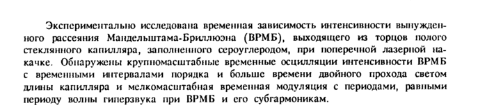 Экспериментально исследована временная зависимость интенсивности вынужденного рассеяния Мандельштама-Бриллюэна (ВРМБ), выходящего из торцов полого стеклянного капилляра, заполненного сероуглеродом, при поперечной лазерной накачке. Обнаружены крупномасштабные временные осцилляции интенсивности ВРМБ с временными интервалами порядка и больше времени двойного прохода светом длины капилляра и мелкомасштабная временная модуляция с периодами, равными периоду волны гиперзвука при ВРМБ и его субгармоникам.