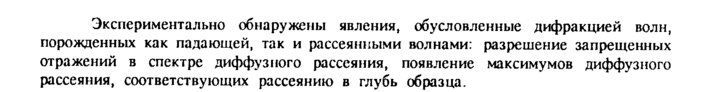 Экспериментально обнаружены явления, обусловленные дифракцией волн, порожденных как падающей, так и рассеянными волнами: разрешение запрещенных отражений в спектре диффузного рассеяния, появление максимумов диффузного рассеяния, соответствующих рассеянию в глубь образца.