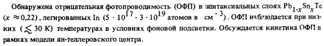 Обнаружена отрицательная фотопроводимость (ОФП) в эпитаксиальных слоях Pb, Sn Те 17 19 3 (х « 0,22), легированных In (5 · 10-3-10 атомов в см ). ОФП наблюдается при низких (^ 30 К) температурах в условиях фоновой подсветки. Обсуждается кинетика ОФП в рамках модели ян-теллеровского центра.